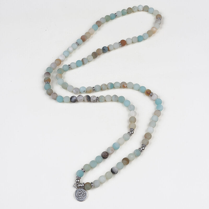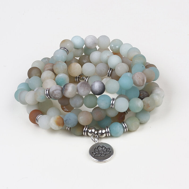 Featuring 108 8mm Amazonite beads measuring about 24 inches around, this mala bracelet can be worn wrapped for a stacked look, or also as a necklace. Beautiful matte finish Amazonite beads symbolize hope, trust, honor, and spirituality. Perfect for meditation, prayer, or spiritual awareness.