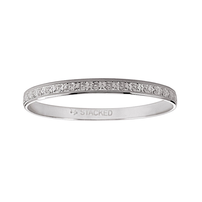 6 mm wide luxe silver bangle with flowers. Made in New York with 100% recycled Argentium silver.