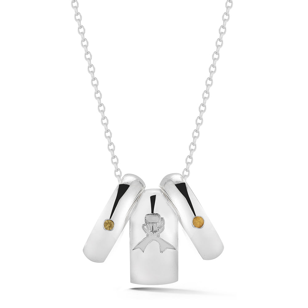 STACKED New York partners with Get In The Ring Foundation to help support families of children battling cancer with the Get in the Ring Mini Stack Necklace. It features one 7 mm Argentium Silver mini ring engraved with the Get In The Ring logo sandwiched by two 3.5 mm Argentium Silver mini rings. The smaller rings are set with yellow sapphires symbolizing the battle against children's cancer. This Mini Stack is strung on an 18-inch sterling silver chain.