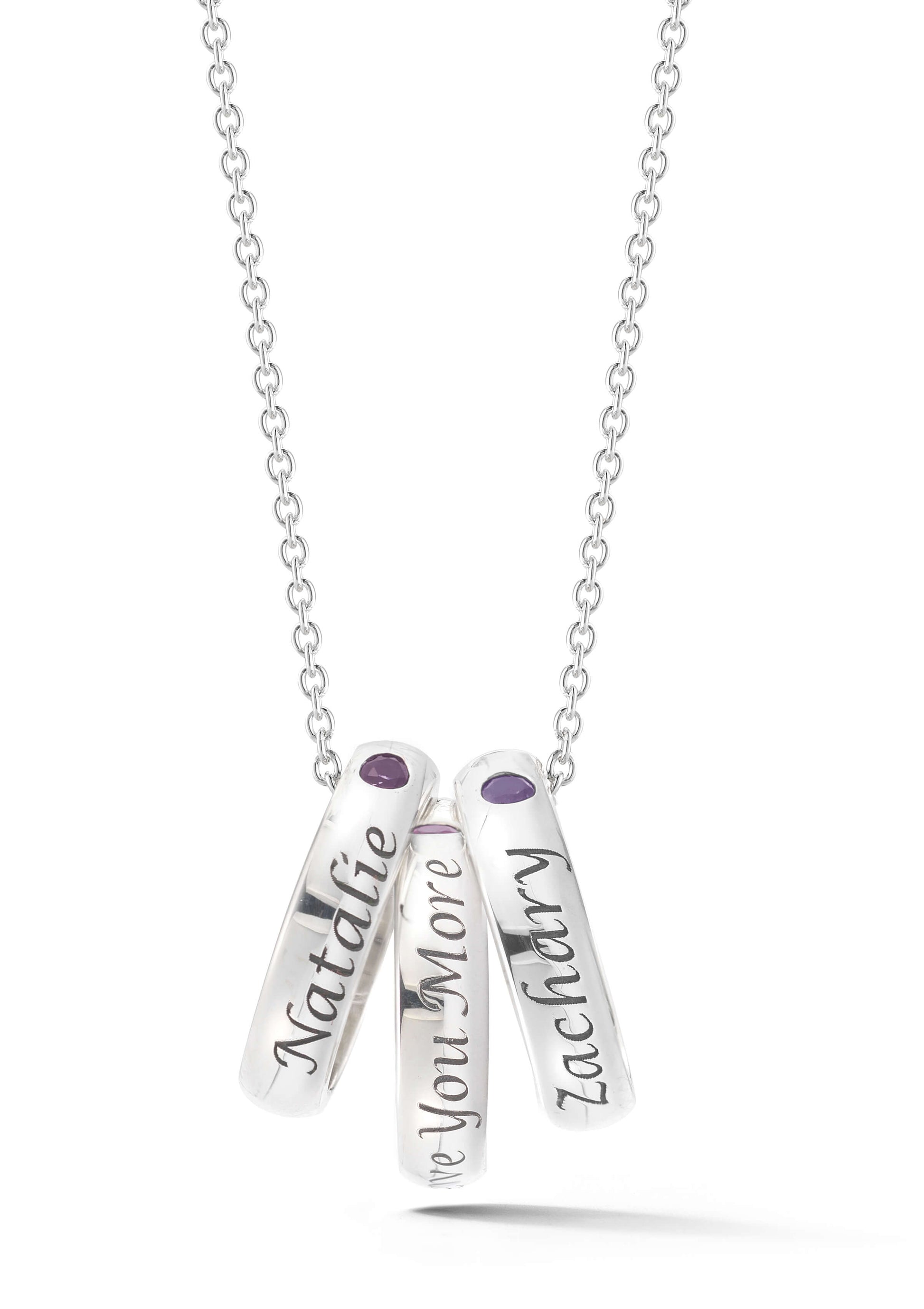 Show that special someone just how much they mean to you with the Love You More Mini Stack Necklace. Featuring two Argentium Silver mini rings engraved with each of your names and birthstones, sandwiched around the sweet "Love You More" mini ring set with red sapphire, this sweet Mini Stack is strung on a 16-inch sterling silver chain.