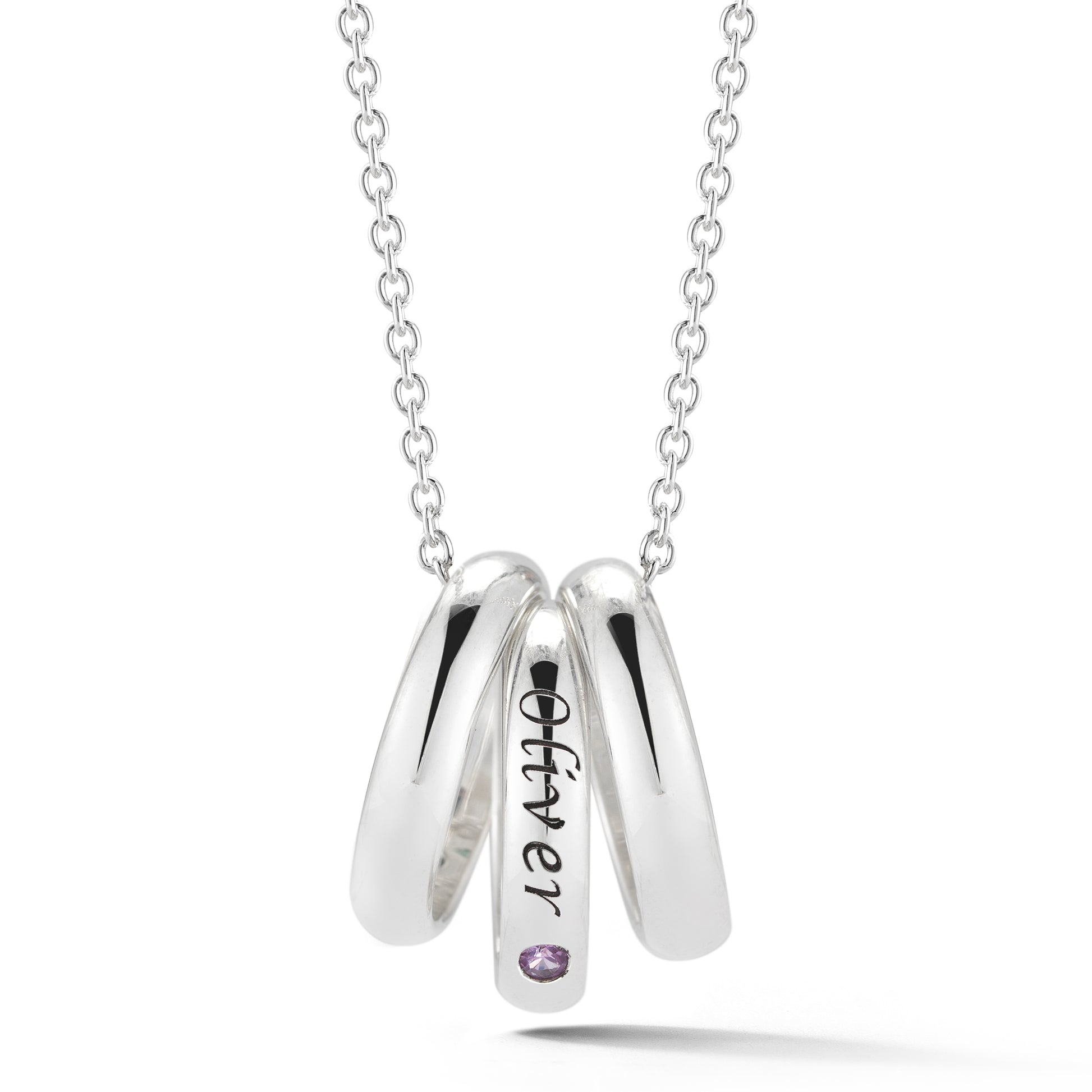 Perfect for mothers, grandmothers, aunts, and more, the Mini Stack Necklace 1 features three Argentium silver mini rings strung on a sterling silver chain. One ring is engraved with the name of the person you want to keep close to your heart, and set with his or her birthstone.