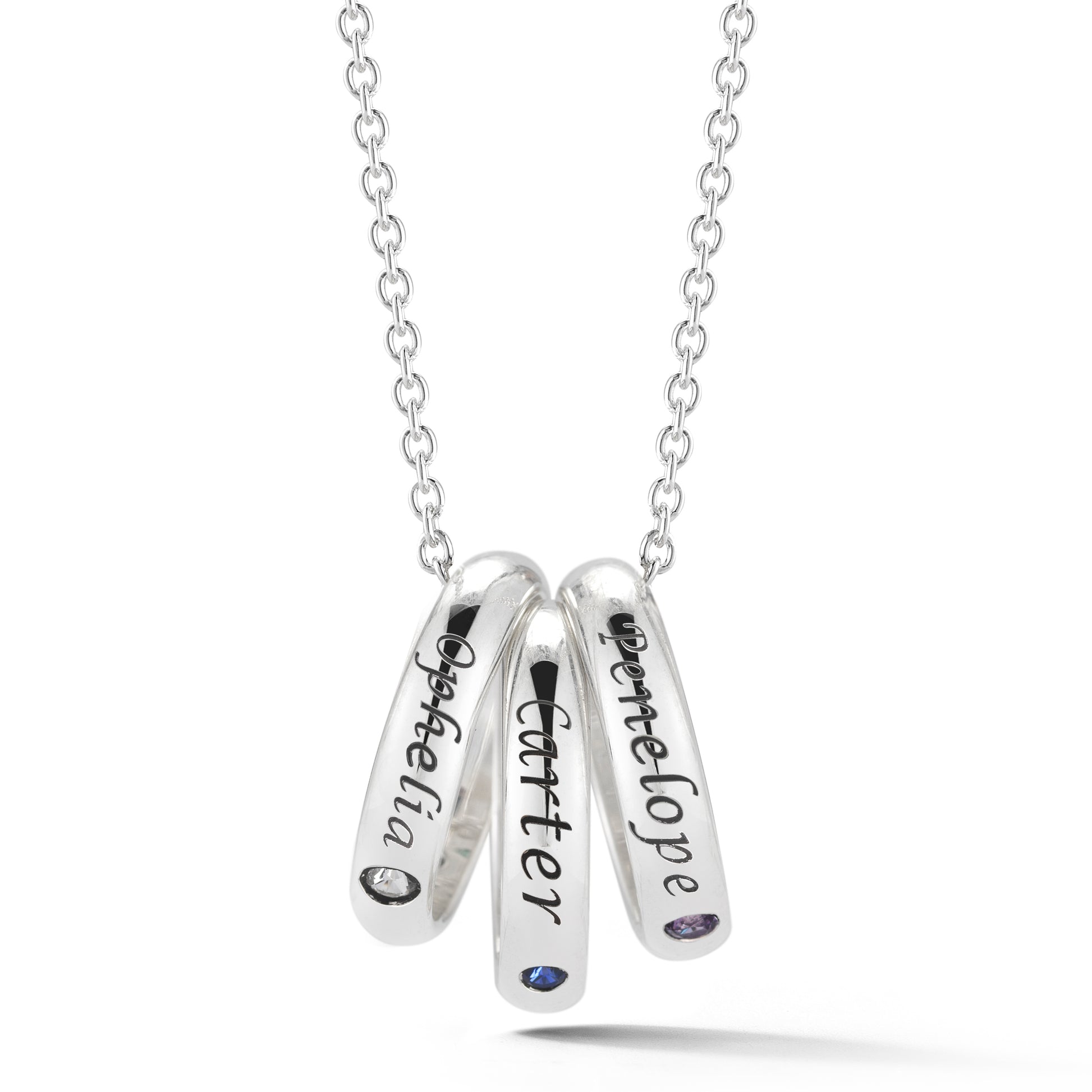 Perfect for mothers, grandmothers, aunts, and more, the Mini Stack Necklace 3 features three Argentium silver mini rings strung on a sterling silver chain. Each ring is engraved with the names of those you want to keep close to your heart, and set with their birthstones.