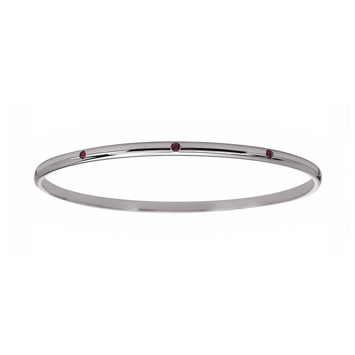 3 mm wide luxe silver bangle with red sapphires. Made in New York with 100% recycled Argentium silver.