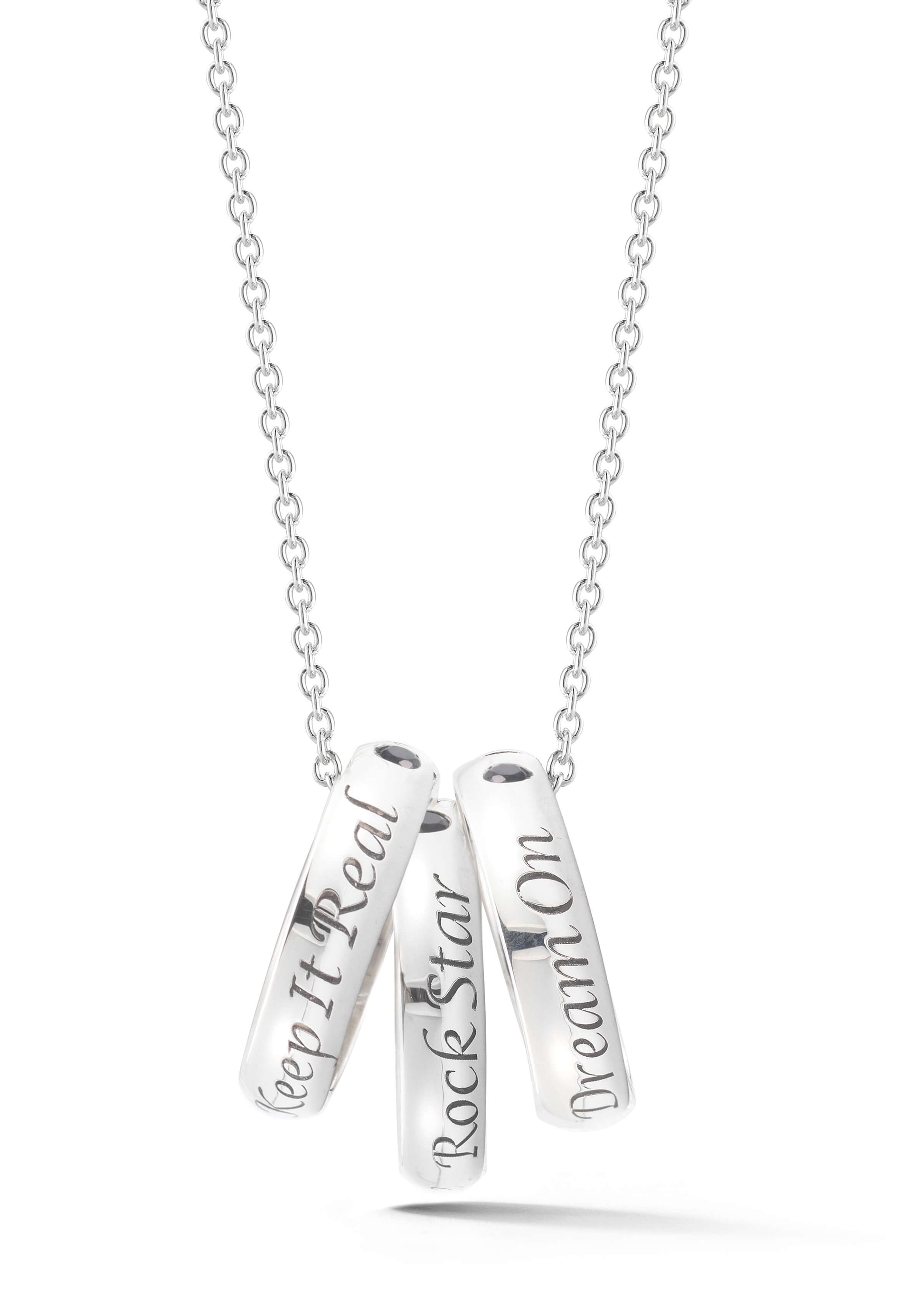 Because she's a rock star. Period. The Rock Star Mini Stack Necklace says so. Featuring three Argentium silver mini rings engraved with the sentiments "Keep It Real," "Rock Star," and "Dream On," the necklace is set with black spinel and strung on a 16-inch sterling silver chain.