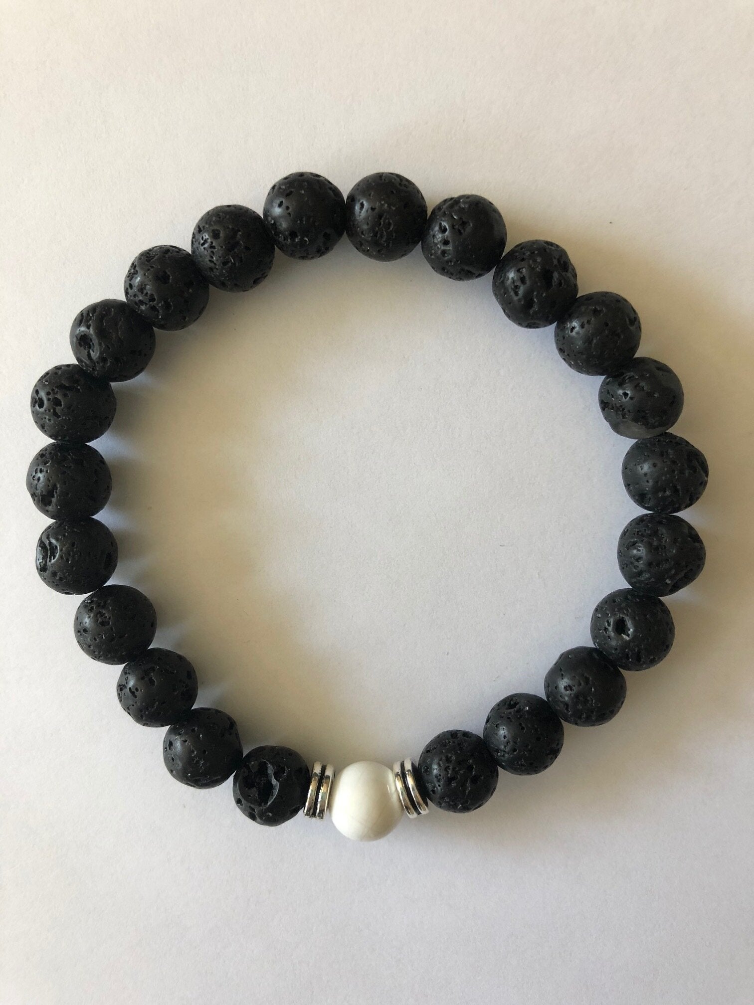 This chakra grounding lava stone bracelet features 8 mm lava stone beads and a central white energy bead symbolizing healing, immunity, and spirituality. Diffuse a few drops of your favorite essential oil for wearable aromatherapy.